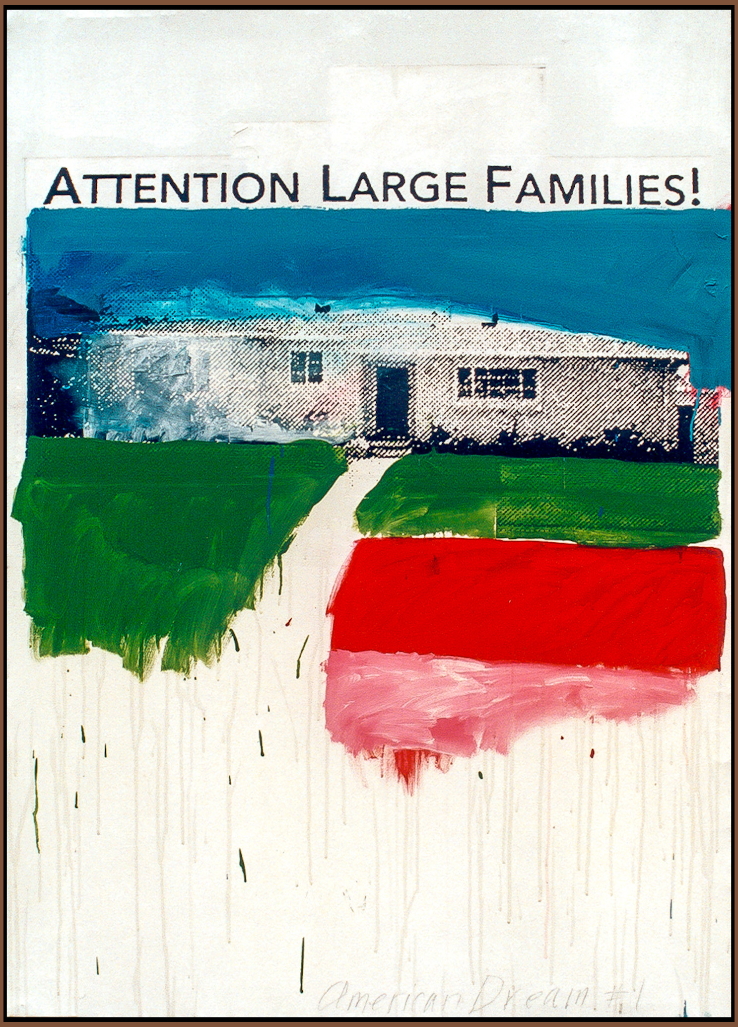 The next week I enlarged the house ad on a photocopier, and attached it the canvas. After painting on top of the photocopies in a sparse fashion – my new series, The American Dream Series, began and this piece was titled “American Dream #1.”