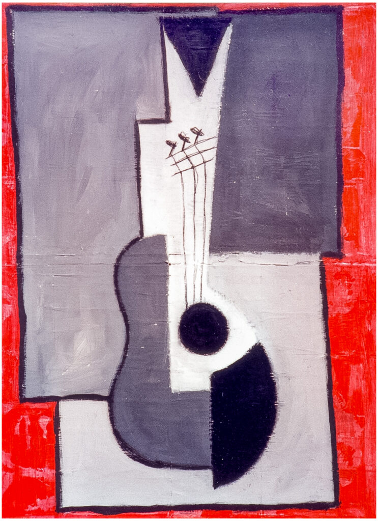 In 1993 my love of Pop Art collided with my love of cubism (as I’ve mentioned in a post before) and one of the results was my guitar. I created this guitar image by doodling when I should have been working… I drew it over and over again in my sketchbook, and started painting it on canvas in April of that year. I must of painted 50-60 canvases with various versions of the image, often mixed with a cup image or a liquor store sign – more on those images in a post down the road.