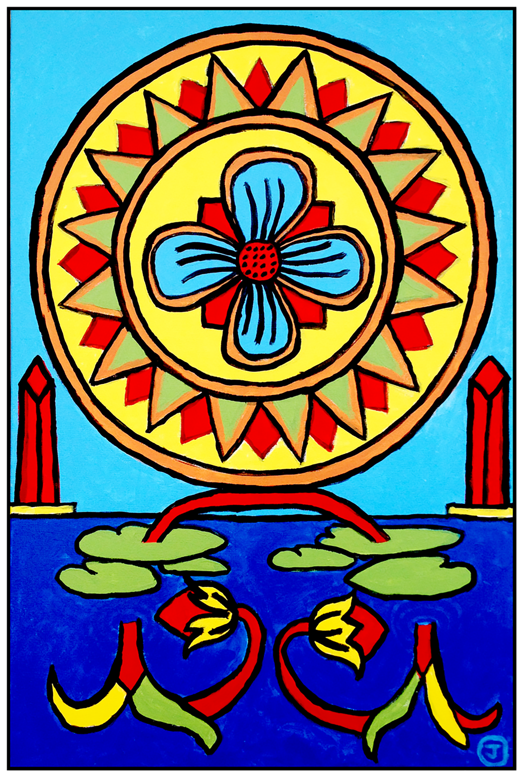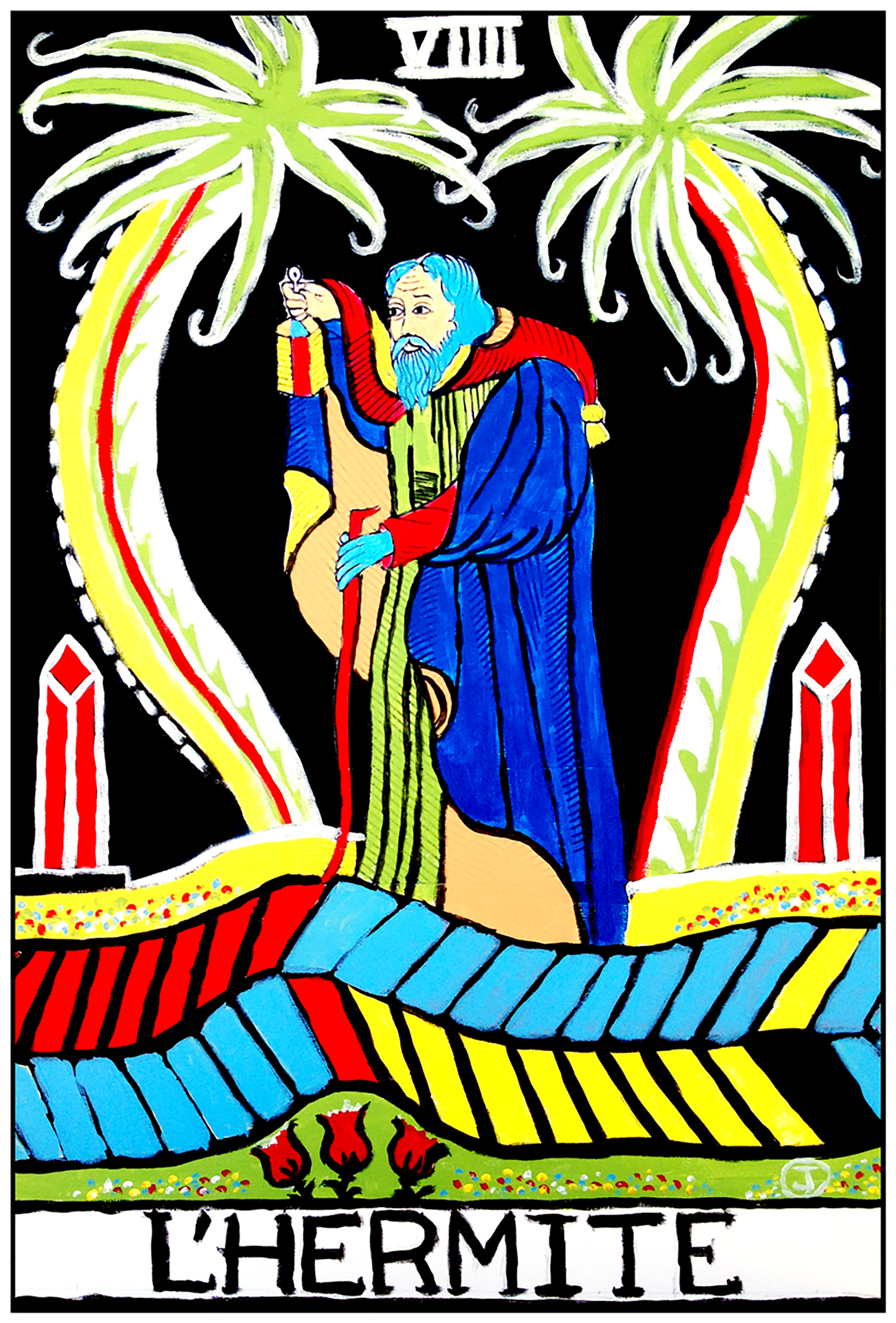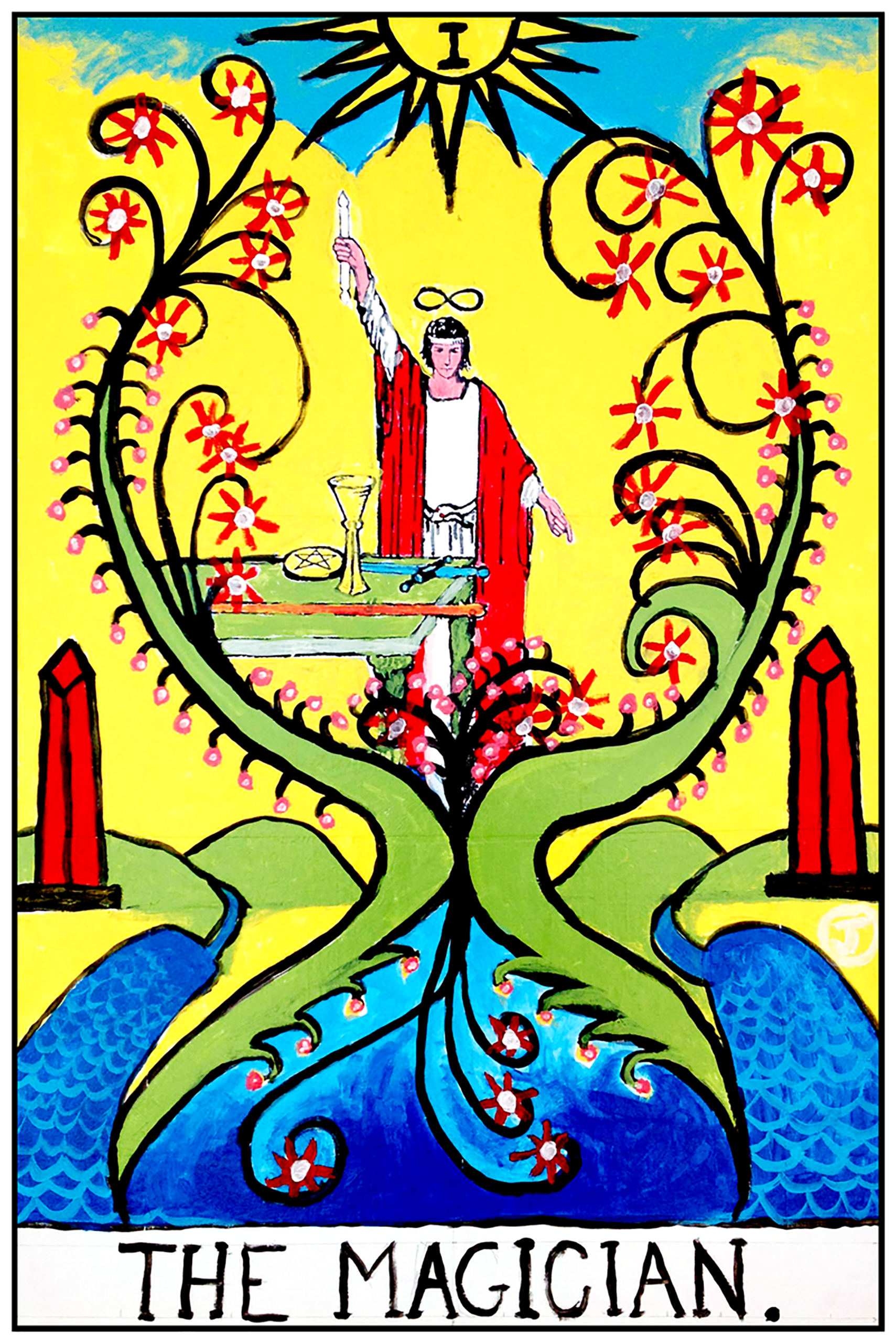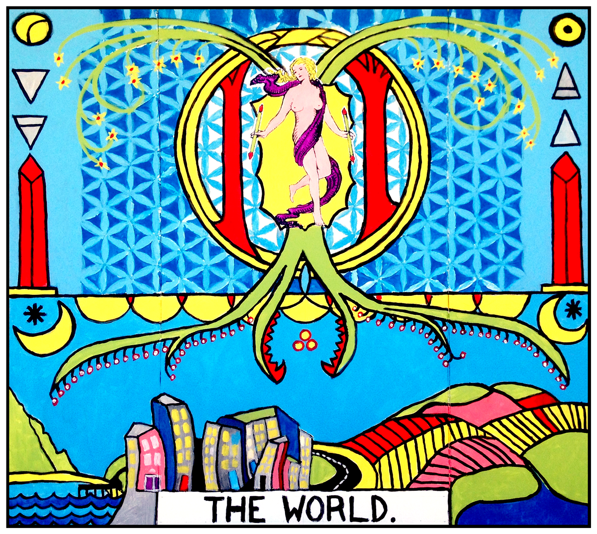 Using colored pencils, photocopies, acrylic paint, and pen and ink, I set out in 2008 to explore the realms of the mystics by following my imagination and intuition. This collection is a small selection of the work involved in doing this exploration. Each piece is a meditation of sorts on the subject of mysticism, whether that’s found in the stars, in the leaves and roots of the World Tree, or in a spread of tarot cards…